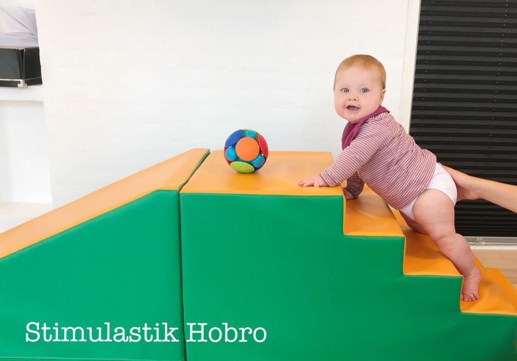 På billedet ser I Gro på 8 mdr., som går på holdet for 2-12 mdr. Jeg kunne se at hun var tæt på at knække koden til at kravle, men manglede det sidste. Jeg fandt skumtrapppen frem og foreslog moderen, at motivere hende til at kravle op ad trappen og hjælpe hende lidt i bevægelserne. Da de kom hjem fra stimulastik den samme dag, kravlede Gro selv rundt.